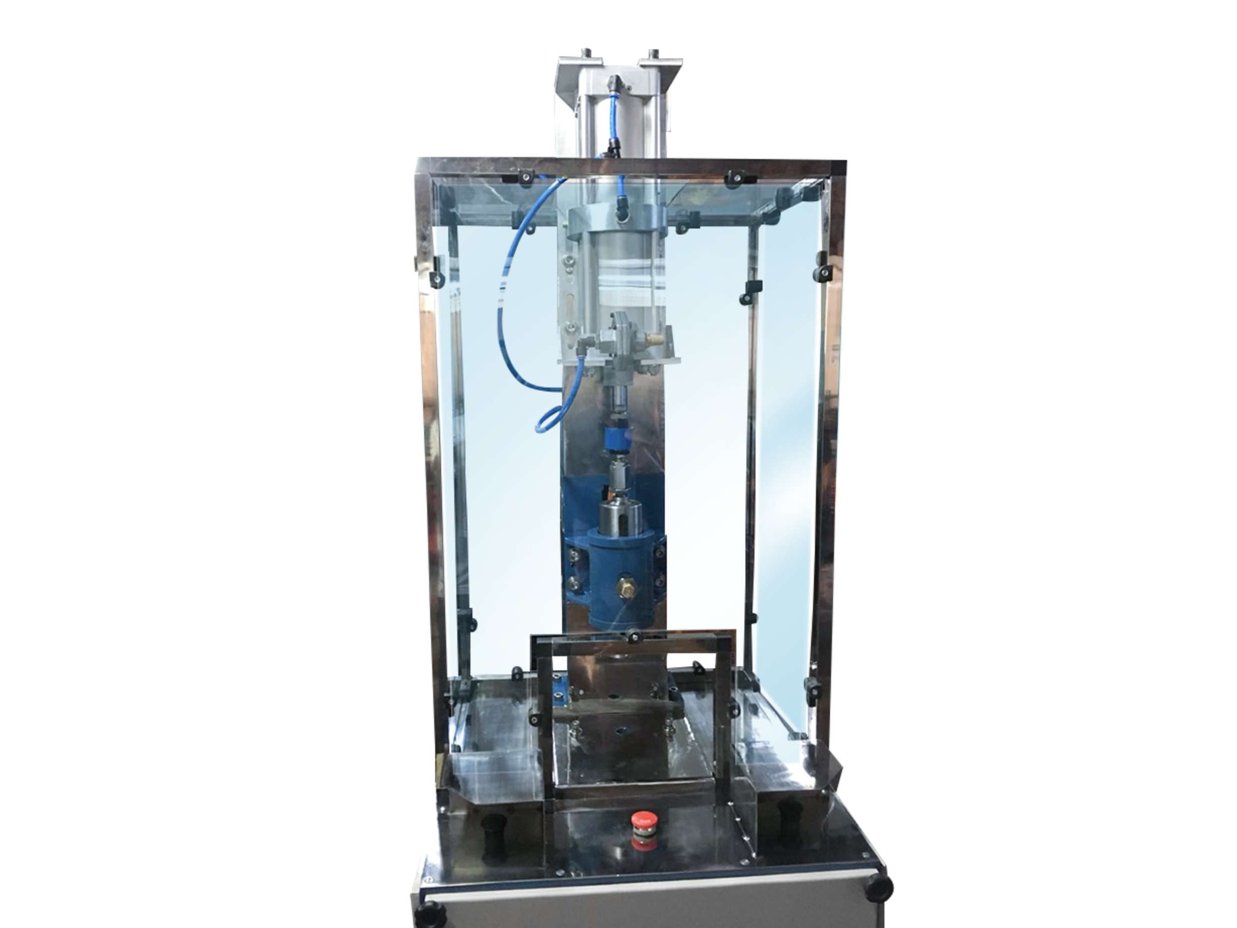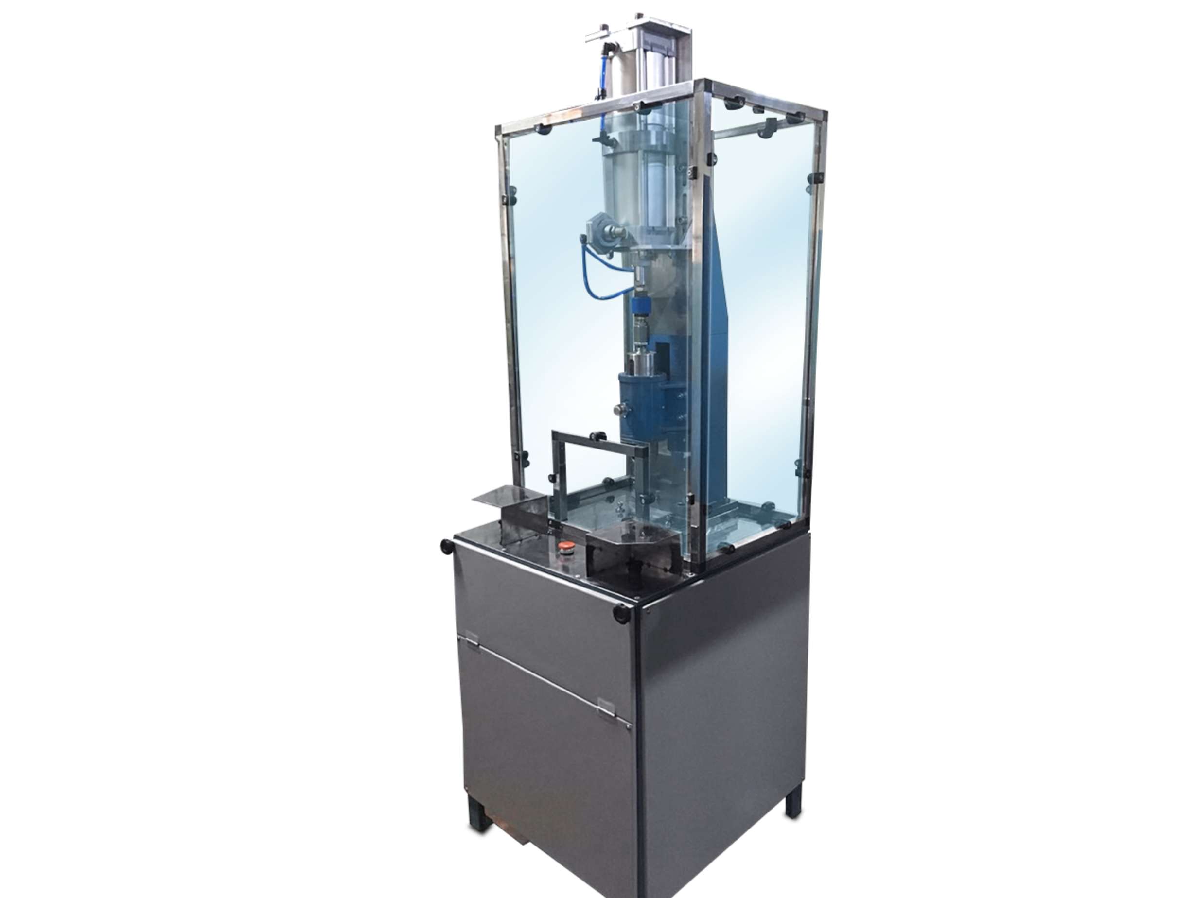 - Sistema de prensagem através de cilindro pneumático, válvula e regulador de pressão, acionados por dois botões de segurança.
